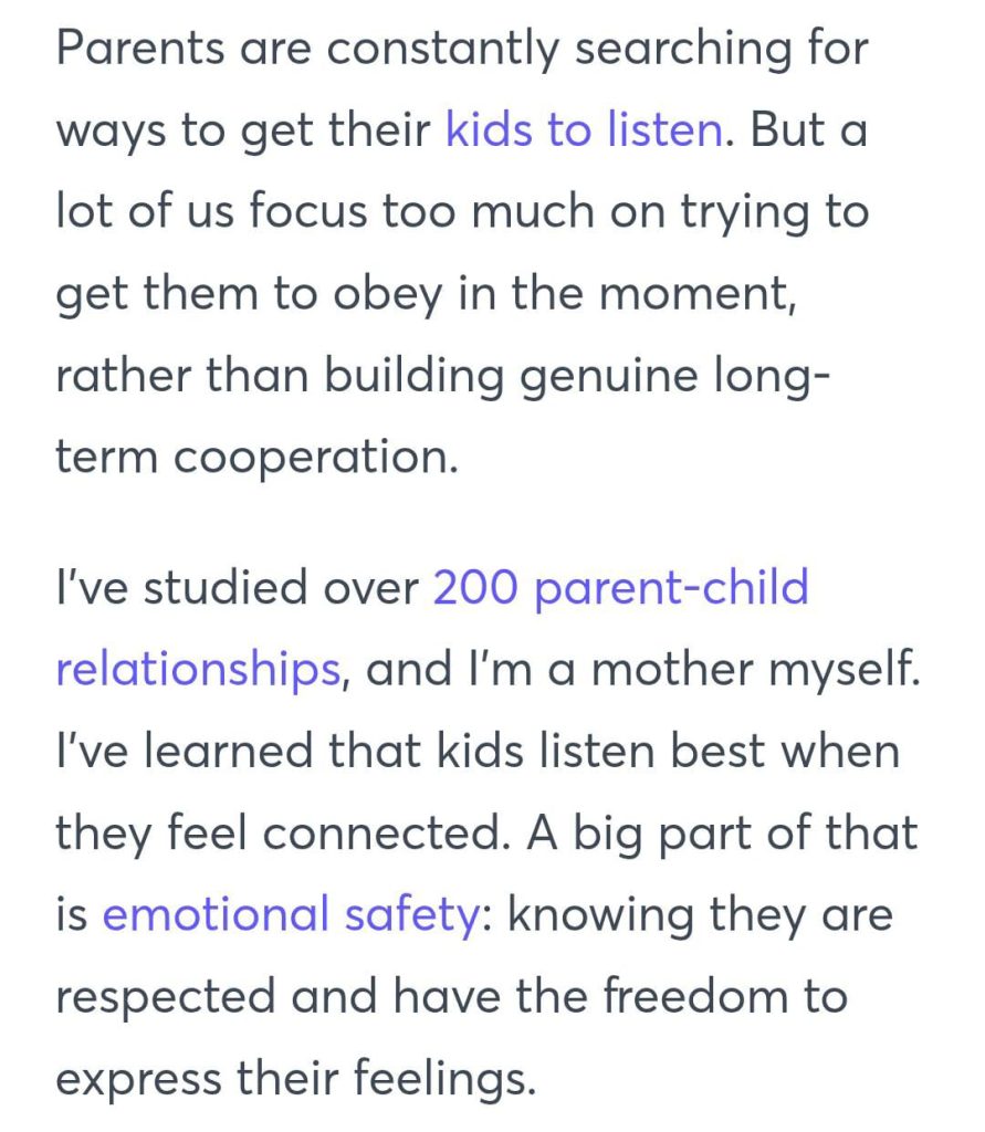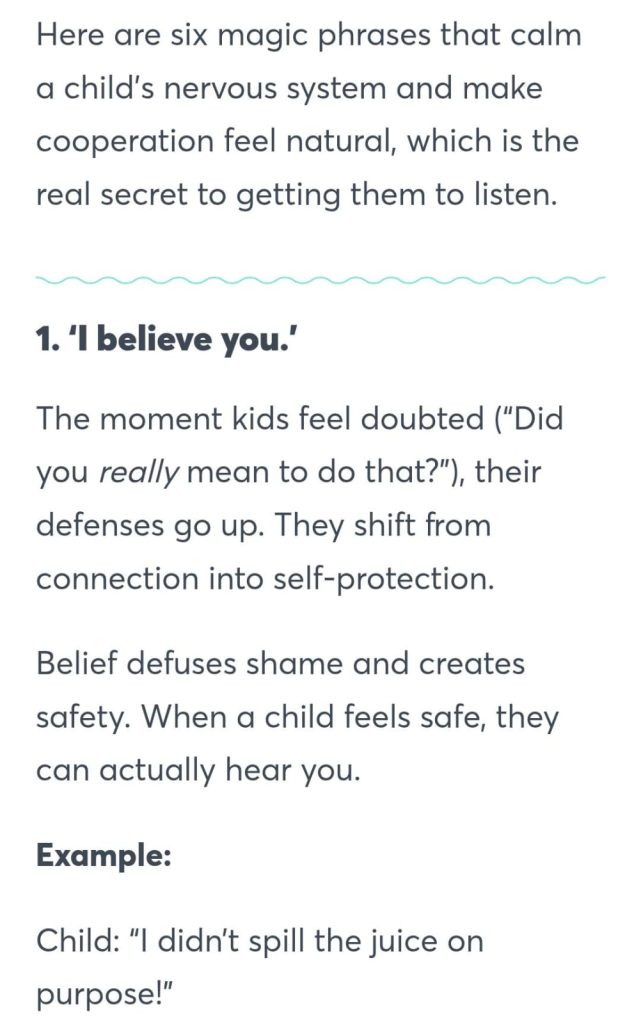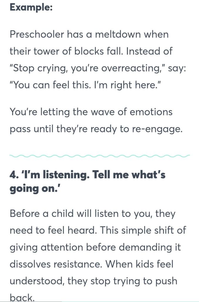 “I always tell parents that if their default is yelling or threatening, then no “magic phrase” will undo the deeper pattern. But when you regularly protect your child’s dignity, make them feel safe, and follow through on boundaries, listening becomes the natural outcome.”