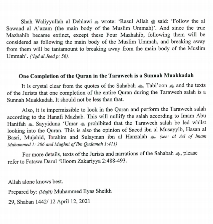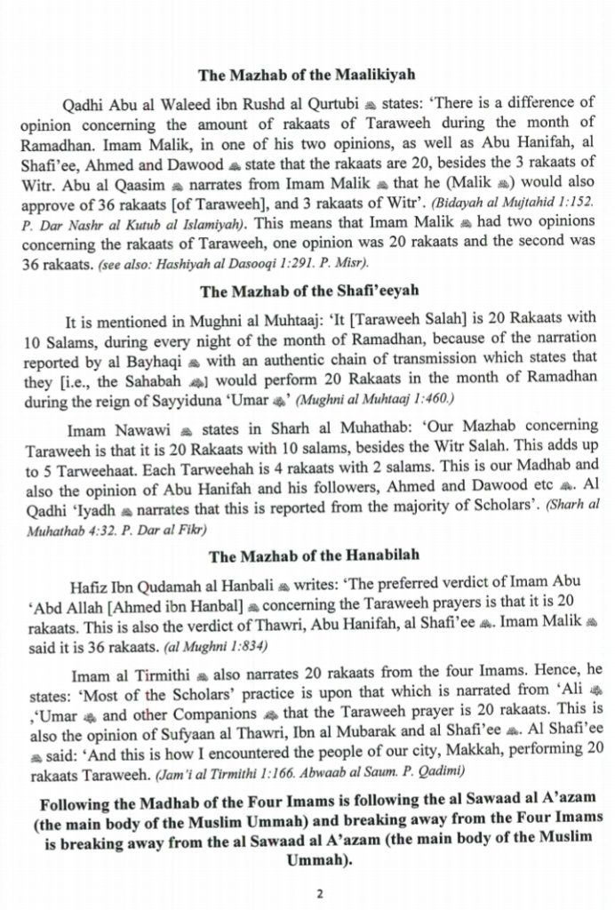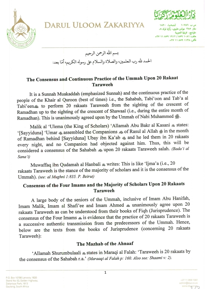 Further for more information Mufti Ridha-ul-Haqq Saheb has solidly refuted those who claim other than 20 Raka’ah’s of Taraweeh. Go see Fatawa Darul Uloom Zakariyya in volume 2 (the english translation is available)