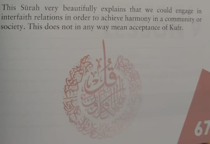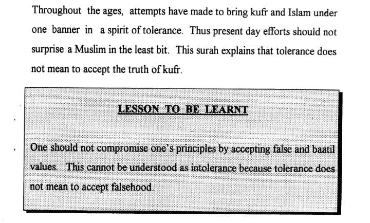 Yes, they wish to throw the teachings of interfaith in the name of Aqeedah. To accomplish their mission of kufr, your children are at a risk. Make sure you save your children from such teachings. They changed their books. Forget that, they changed the interpretation of Suratul Kaafiroon to achieve this. Warn every believer. Your child will be happy to pray with disbelievers. Inna lillah!