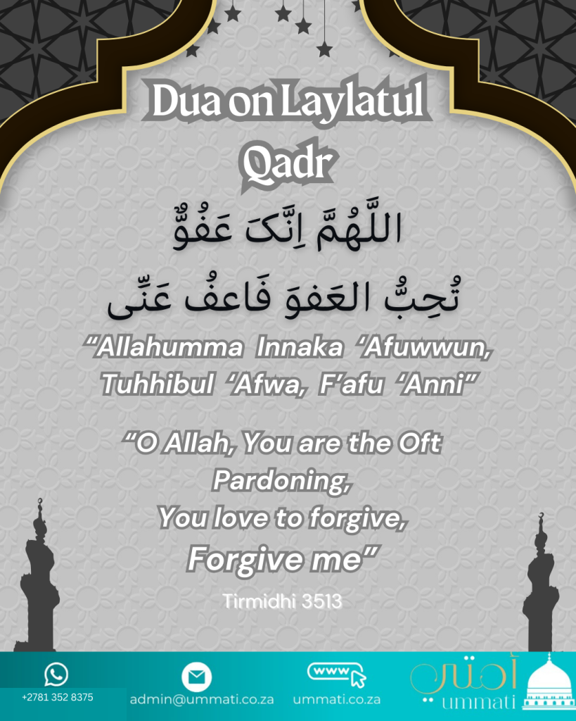 Sayyidah Aisha Radhiyallaha Anha reported: I said, “O Messenger of Allah, if I know which night is the Night of Decree, what should I say during it?” The Messenger of Allah, peace and blessings be upon him, said, “
