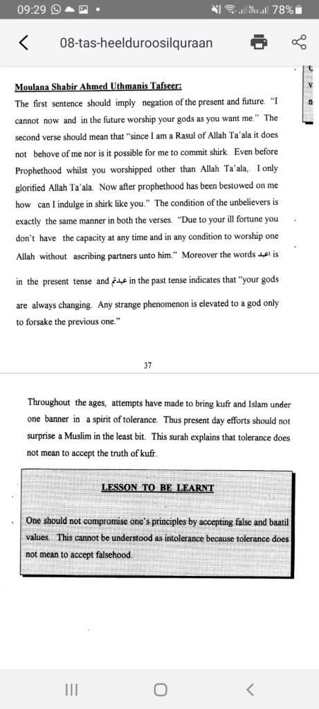It is clear and we have to remind the Ummah of our children in Maktab who were exposed to the changed syllabus to twist interfaith from Kufr to the now new brand of “acceptable”. This was all done with clear intentions and not by mistake, a clear cut adulteration of the Haqq and a kufr interpretation of the Sublime and Glorious Quraan Shareef. Remember this old abandoned Kitaab taught in Madaaris? Tasheel Duroosil Quraan and the old interpretation of Suratul Kaafiroon: