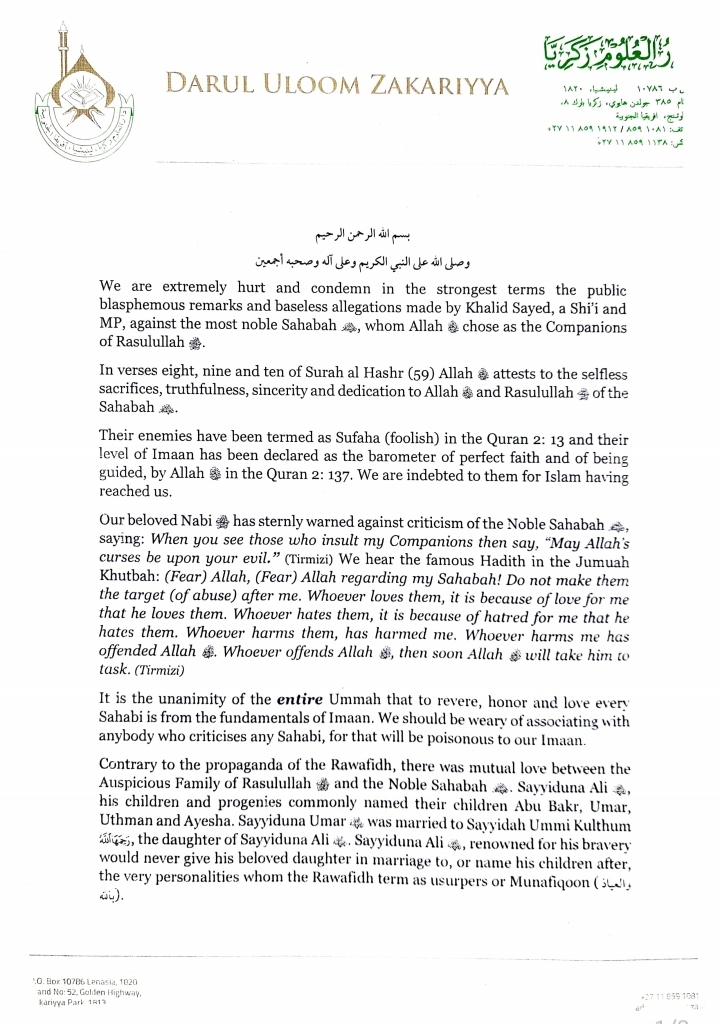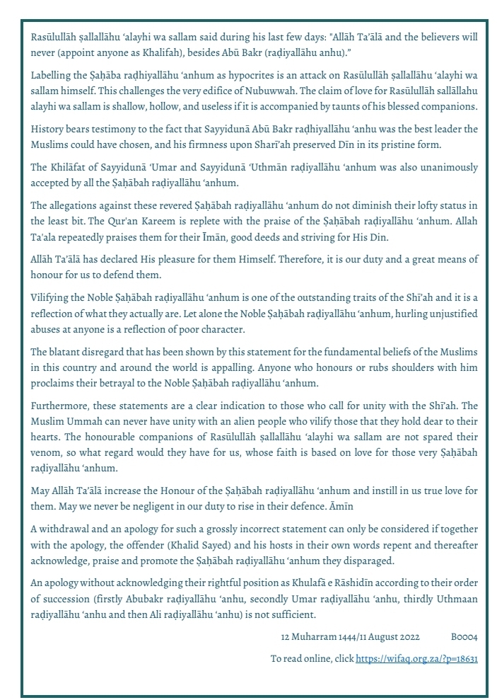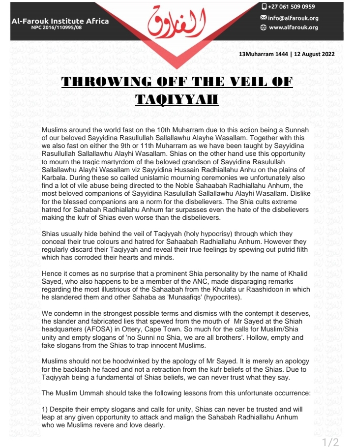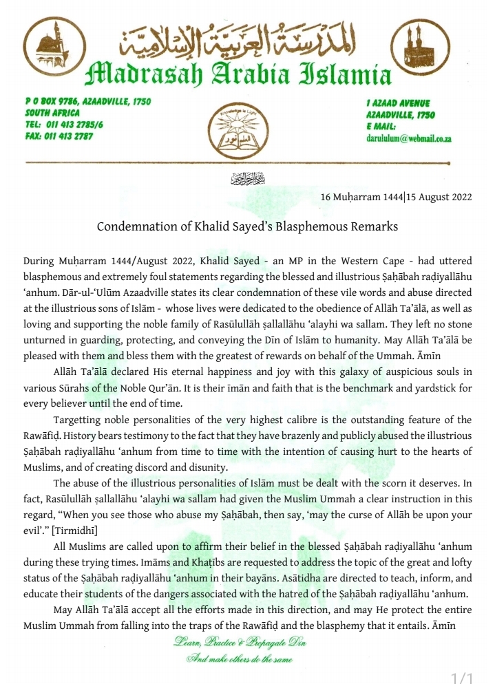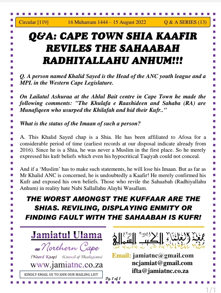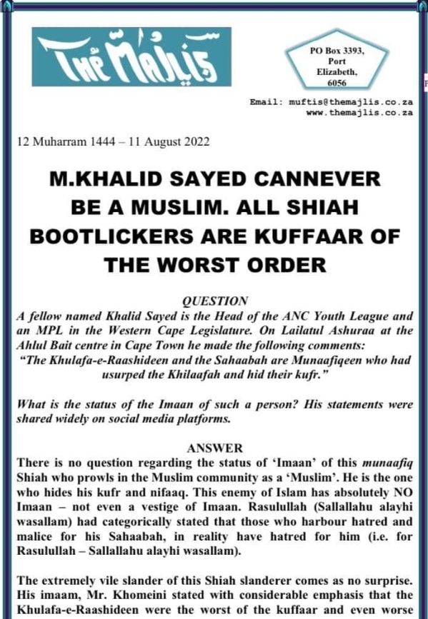 On the 7th August 2022, Muharram 1444, Laylatul Aashura, an ANC MP, Khalid Sayed made hateful statements in a 30-minute lecture conducted at the Shia Headquarters, Ahlul Bayt in Cape Town on Sunday, under the permission of the Shia group, Ahlul Bait Foundation of South Africa (AFOSA). Sayed said: