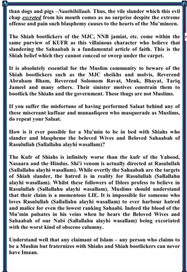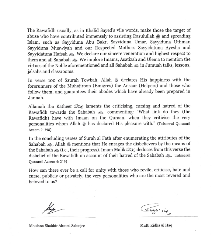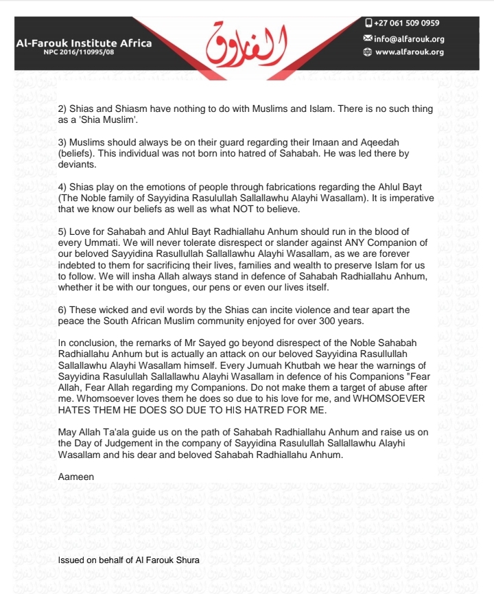 South African Muslims rejected and outrightedly remained firm on the stance and collectively chanted the kufr of Shias. They unapologetically rejected the statements of Sayed.