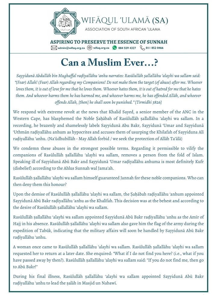 Khalid Sayed, a senior member of the ANC, has referred to the Khulafa-e-Raashideen (particularly Sayyiduna Abu Bakr, Sayyiduna Umar and Sayyiduna Uthmaan Radiallahu Anhum) as hypocrites. Any true Muslim that refers to the Sahaabah as hypocrites, will lose his Imaan. If, by referring to an ordinary Muslim as ‘Kaafir’ one loses his Imaan, what can then be said about those personalities for whom Allah Ta’ala has declared His pleasure?![Re:- Fataawa Mahmoodiyyah Pg.55/56 Vol.2]