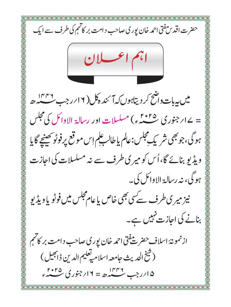 The date of this important announcement by Mufti Ahmed Khanpuri Hafidhahullah is the 16th Rajab 1446/ 16 January 2025 whereby Mufti Saheb clearly states any Aalim or student takes a picture or takes a video will not receive permission in Ahaadith.