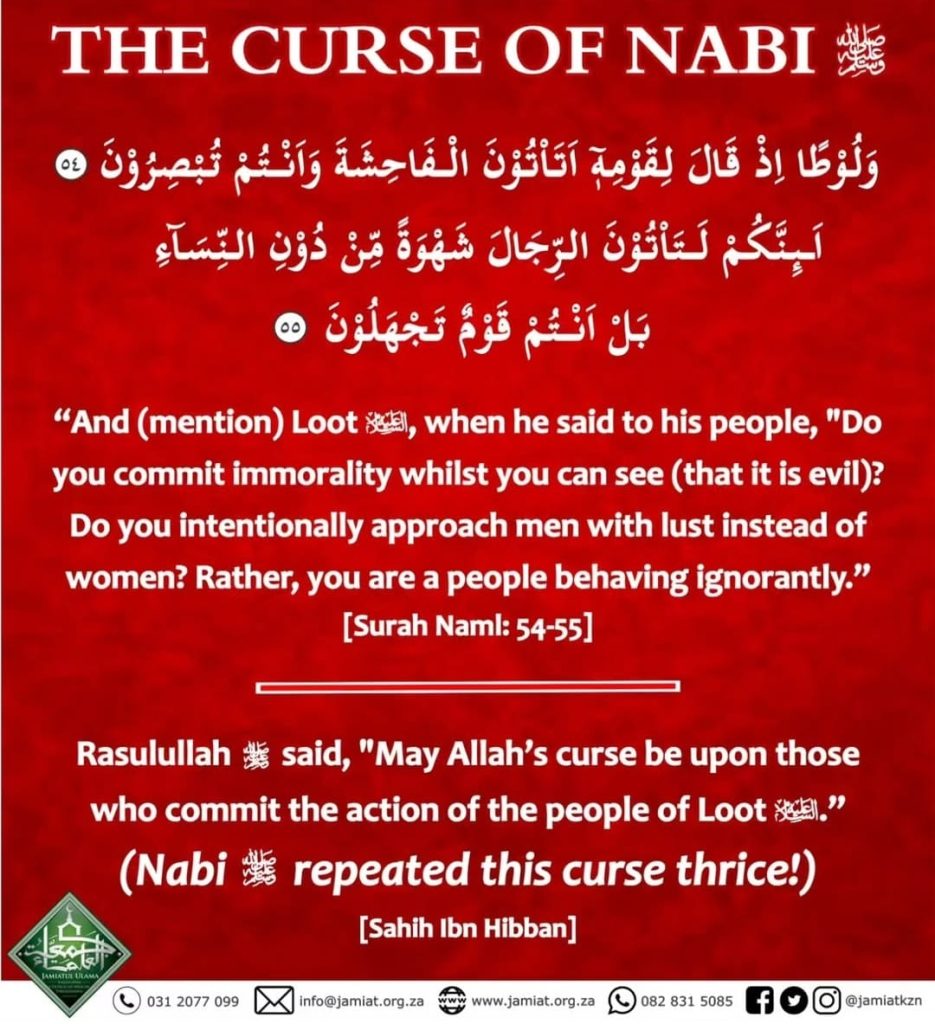 Clearly the Qur’aan Shareef opposes those who do not have an atom of its sublime understanding. The LGBTQUEER’S says the verse refers to rape but the verse clearly opposes them and their dead priest. “Do you approach men lustfully besides for women, rather you are a nation behaving foolishly” Surah Naml Verse 54 v& 55