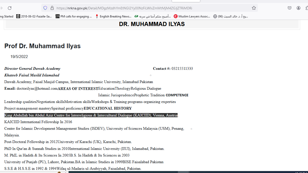 The Moulana referred is Dr Muhammad Ilyas, Imaam of Faisal Masjid Islamabad. The website nrkna.gov.pk – NATIONAL RAHMATUL-LIL-AALAMEEN WA KHATAMUN NABIYYIN has his direct profile and history: