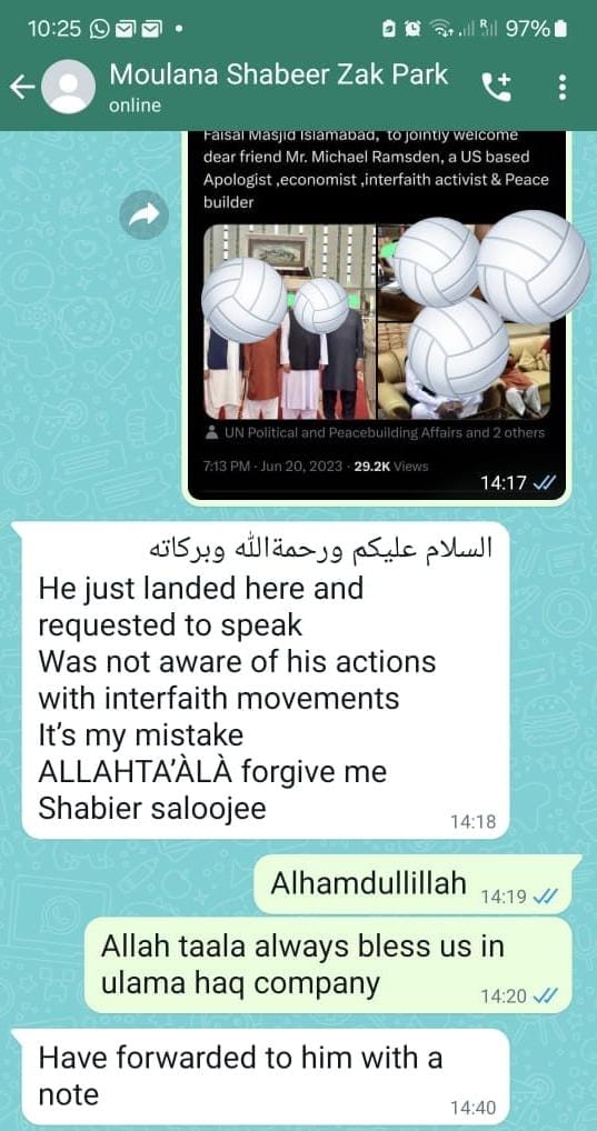 Thus it is extremely bizarre to assume that Moulana Shabbier Saloojee knew the background of the unplanned voice of the interrelgious Moulana Ilyaas. However when it was brought to Moulana Shabbier Saloojee’s notice, the response was filled with regret: