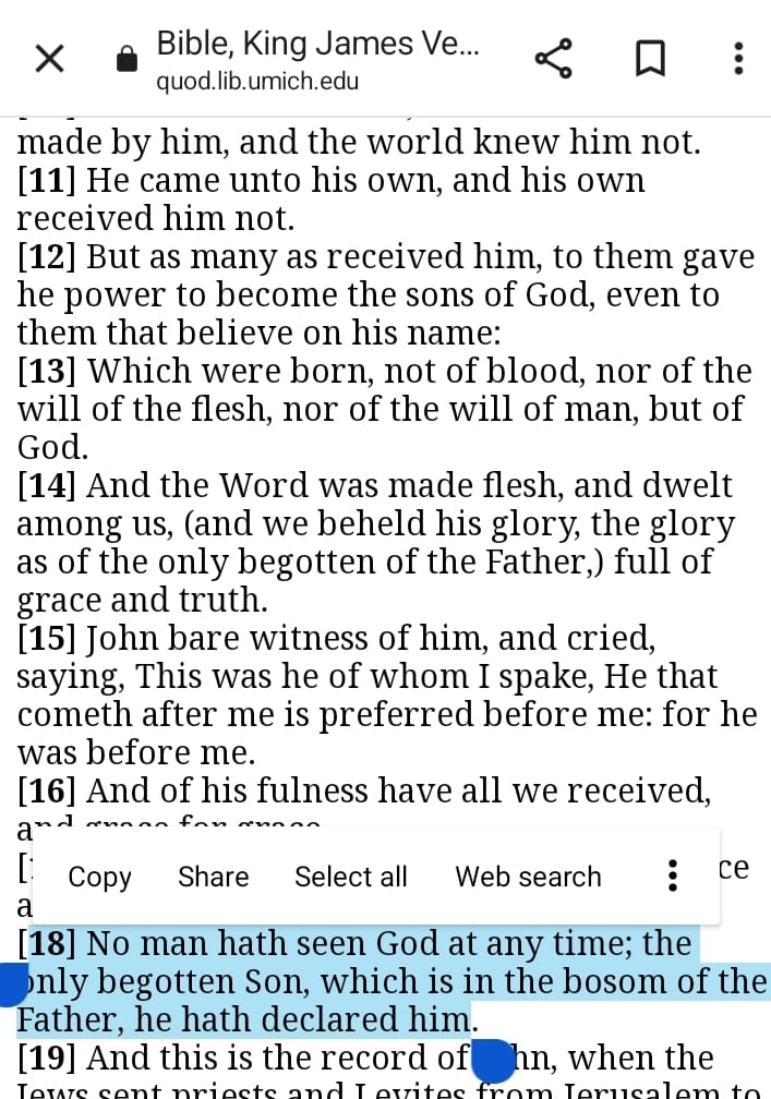 “No man hath seen God at any time, the only begotten son, which is in the bosom of the Father, he hath declared him.”