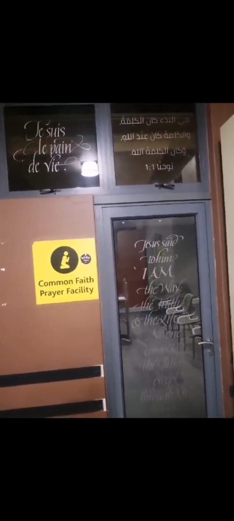 I got excited to see the amount of consideration taken for us Muslims in our country as Mufti Menk always teaches us to be grateful for being able to have access to such wherever we go and atleast we can pray in peace. This time, however, I took a snap of the door of this multi faith room excited to know which verse of the Quraan did they place on the door symbolizing our beautiful Deen of Islam? Please give the reference and translate it too! Jazaakallah