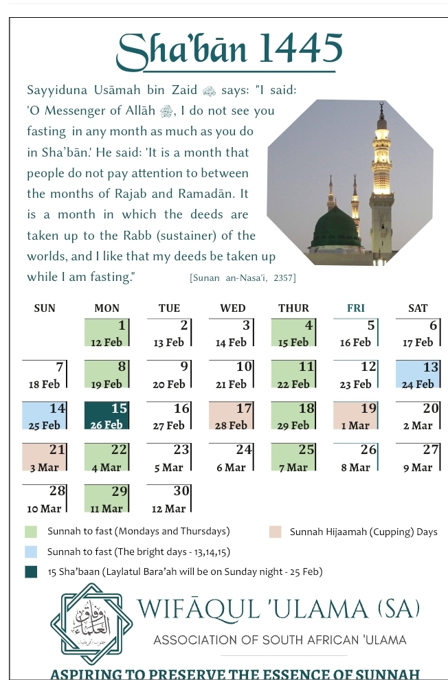 Due to the earlier sighting of the Sha’baan moon in other parts of the world, Saturday night, the 24th of February 2024 will be the 15th of Sha’baan thus the desired fast for those countries will be on the Sunday 25th February 2024.