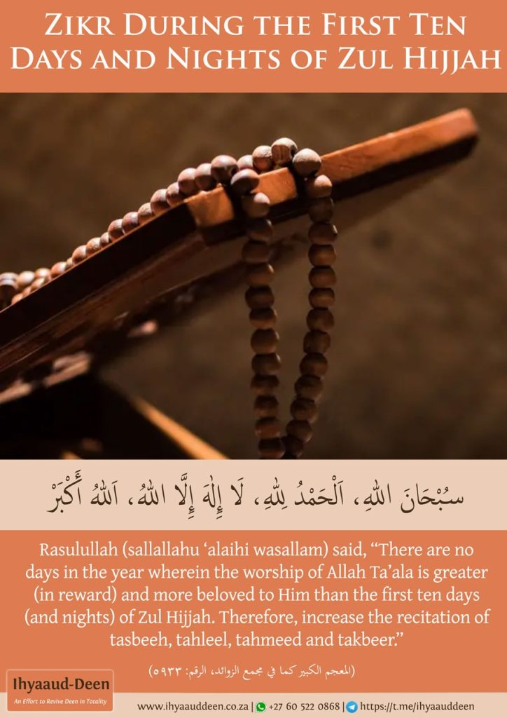 Sayyiduna Abdullah Ibn Abbas Radhiyallahu ‘Anhu reported: Rasulullah Sallallahu ‘alaihi wa Sallam, said, “No deeds are more pure to Allah Almighty, nor greater in reward, than good deeds performed in the ten days of the month of sacrificing.