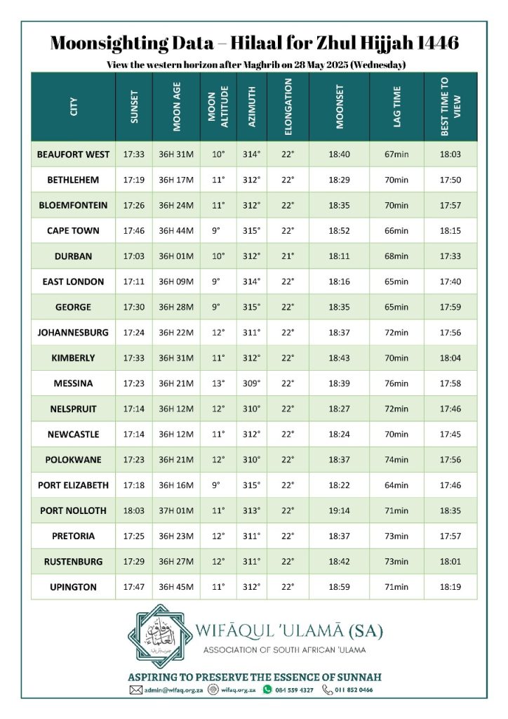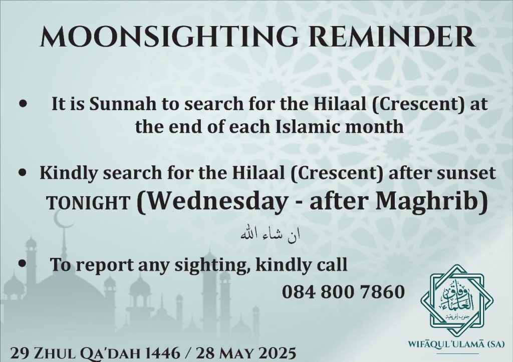 Tonight, at the time of Maghrib after the Salaah in South Africa and other areas who keep up the law of the golden Shari’ah, will go out to scan the skies in search of the moon with the naked eye, if it is sighted, they will now embrace the 10 days of Dhul Hijjah. The Hujjaaj will be occupied in great ‘Ibaadah during these moments but Allah Ta’alaa has made these days noble for all. Thus we need to realise its importance and once the value is attained by the tawfeeq of Allah Ta’alaa then one will not squander these special moments no matter where they are.