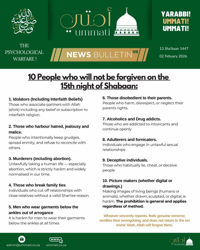 Ummati News Bulletin 09 – 10 People not Forgiven on 15th Shabaan February 2, 2026 Ummati News Bulletins 444 Views Related Articles Ummati News Bulletin 11- Making your Ramadan Meaningful February 17, 2026 Ummati News Bulletin 10 – Animate-Free Browsing February 10, 2026 Ummati News Bulletin 07 – Statement Released By Madressah Taleemuddeen January 29, 2026 Share