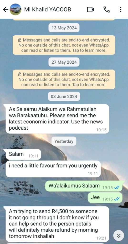 The cyberworld has proven to be unsafe. Do not transfer money to even your Mother (if she has requested funds from her whatsapp number to be transferred in a strange account) until you investigate go to her and hand over that money physically. The below is a typical example of many who almost got caught. Report these incidents to Whatsapp as they leave us bare without real protection. A family member of Moulana Khalid Ya’coob informed us: