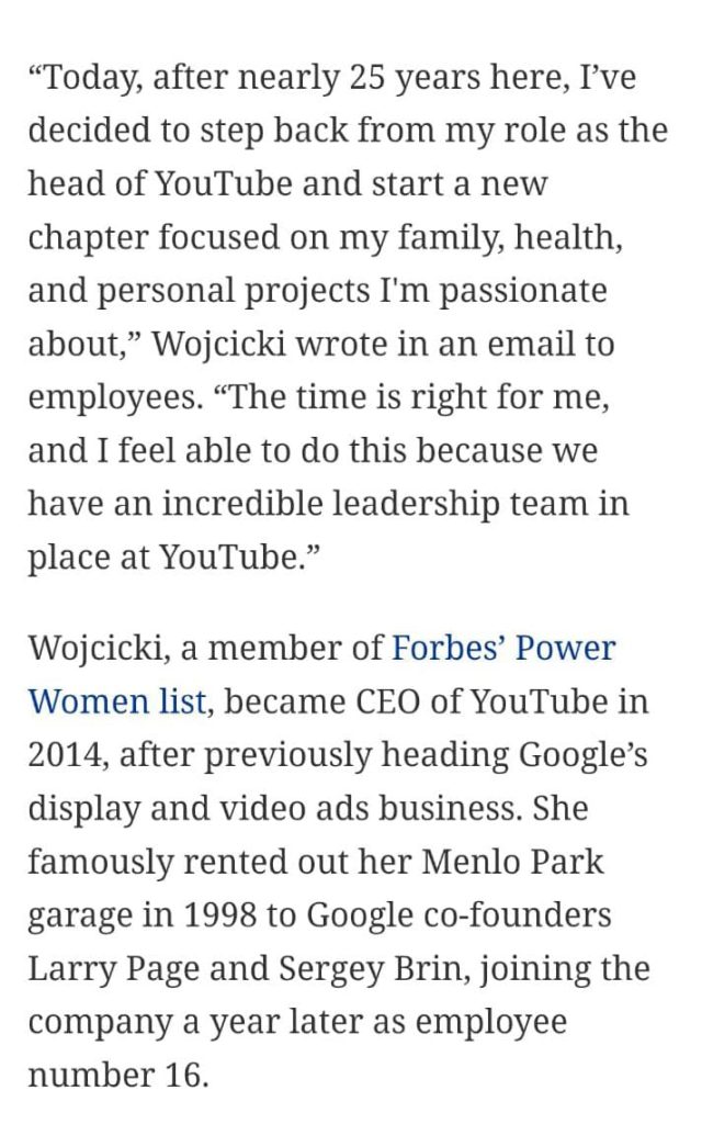 The above is taken directly from Forbes.com admitting her reason: “Today, after 25 years here, I’ve decided to step back from my role as the head of YouTube and start a new chapter focused on my family, health and personal projects I am passionate about”.